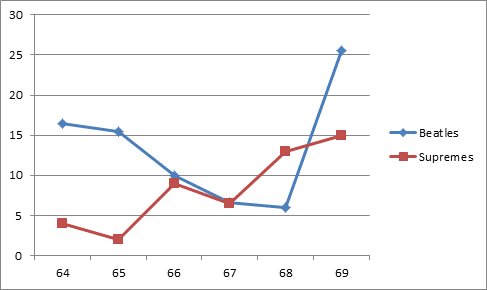 In music, just like everywhere else, if you slice data thin enough, you can get some pretty interesting results. Take a look at Exhibit A below for instance. This chart shows that for one year at least, the Supremes defied preconceptions by featuring more guitar in their number one hits than The Beatles did. Behold 1968! Obviously, an explanation is in order… After all, how on earth can this be? The Supremes were a vocal group! The Beatles were so much more. Indeed they were — but let’s dig deeper. (Something I’ve done repeatedly through my Number One with an AXE! ebook series which focuses on guitar work in America’s number one hits.)