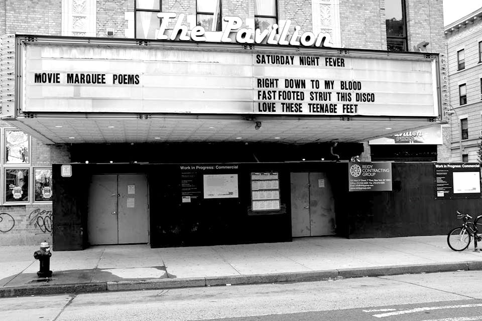 Over the past few months, the movie marquee at the long-shuttered Pavilion Theatre in Park Slope, Brooklyn has served not so much as space a for advertising what’s playing (the theater is currently being renovated by new owners Nitehawk Cinema), but as the site of an art installation project for which haiku based on movies are displayed. The project — entitled Movie Marquee Poems — is the brainchild of Saint Flashlight, an art duo consisting of Molly Gross and Drew Pisarra. Gross took some time to answer some questions about the project’s genesis and her own involvement as well as what lies ahead.